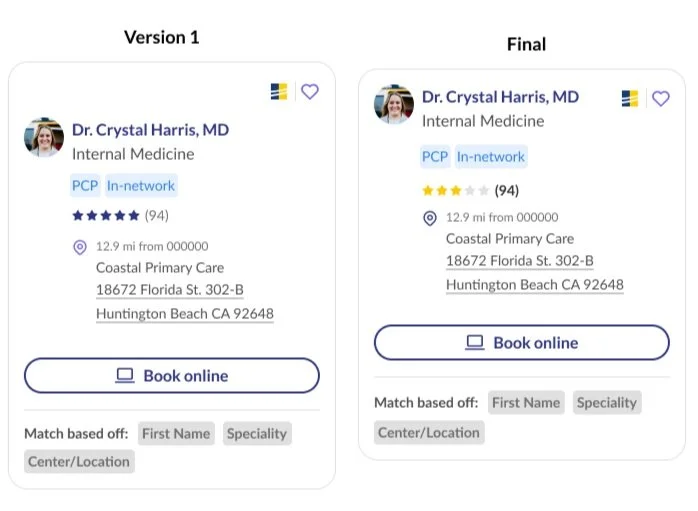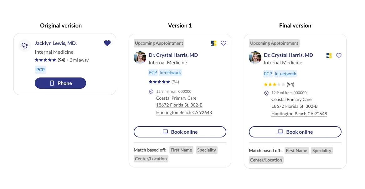 70% increase in conversions: Revisions to the search results page boosted the conversion rate by 70% by making it easier for users to find and book appointments directly online. Users greatly preferred the online appointment management experience, as opposed to handling everything over the phone.