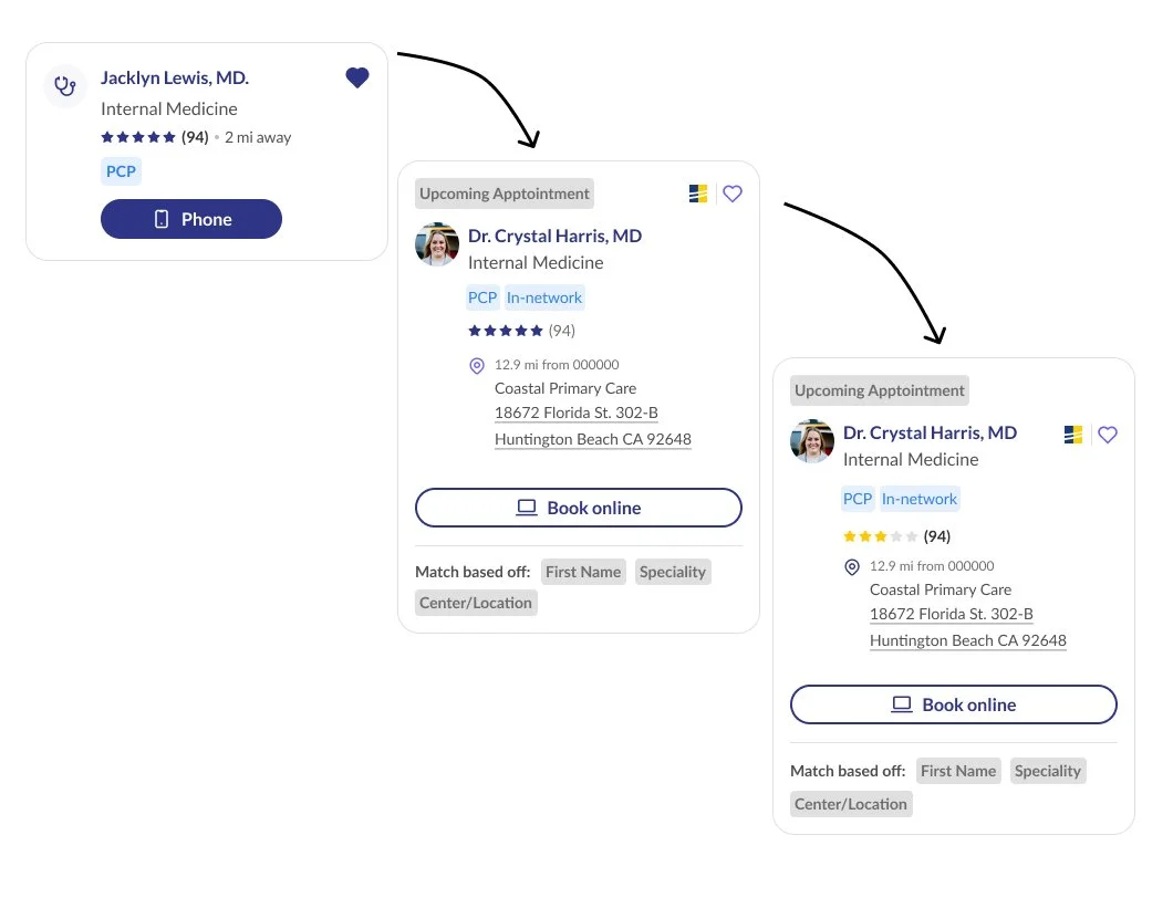 However, recognizing that scrolling is a common user action or understanding that it’s acceptable not to display more than one card above the fold can enable users to book appointments directly from the search page.
