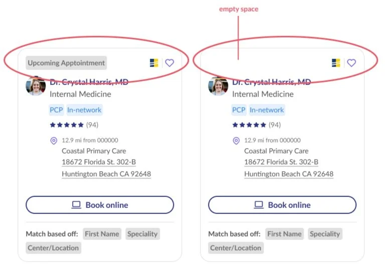Since the tags “Upcoming appointment” and “Past appointment” appear less during searches, I began stacking the cards with only one tag on them, leaving the rest without the tag. I realized the unused empty space was prime real estate that I hadn’t utilized effectively. This empty space didn’t give users a visual break; instead, it created unnecessary breaks and awkward transitions between the cards.