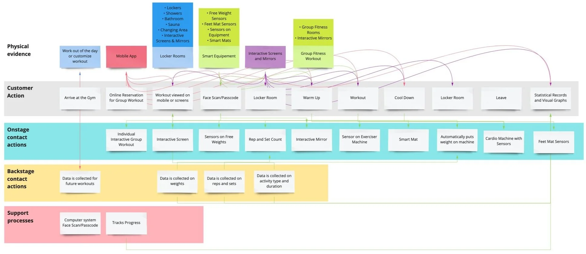 The concept of the blueprint, below, visualizes the relationship between the different touch points throughout the service. The arrows indicate the dependencies of the touch points with the actions. The blueprint's goal is to capture the entire gym experience from the exerciser's point of view. The service design had five actions: physical evidence, customer action, onstage contact actions, backstage contact action, and support process.