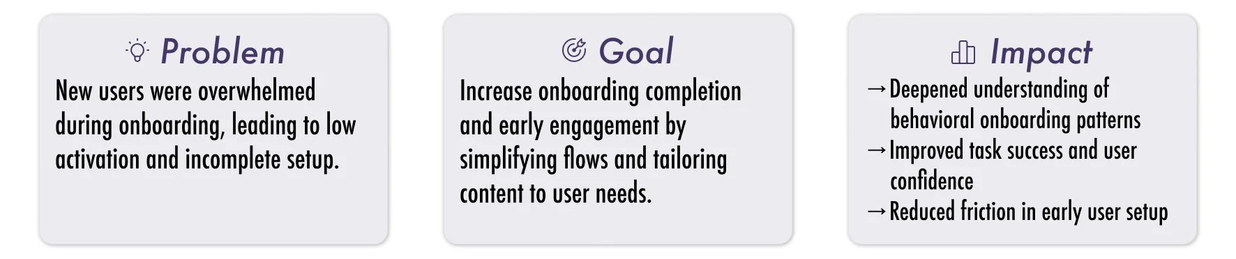 • Final solution & hypotheses — A preview of the onboarding flow and how we’ll measure success