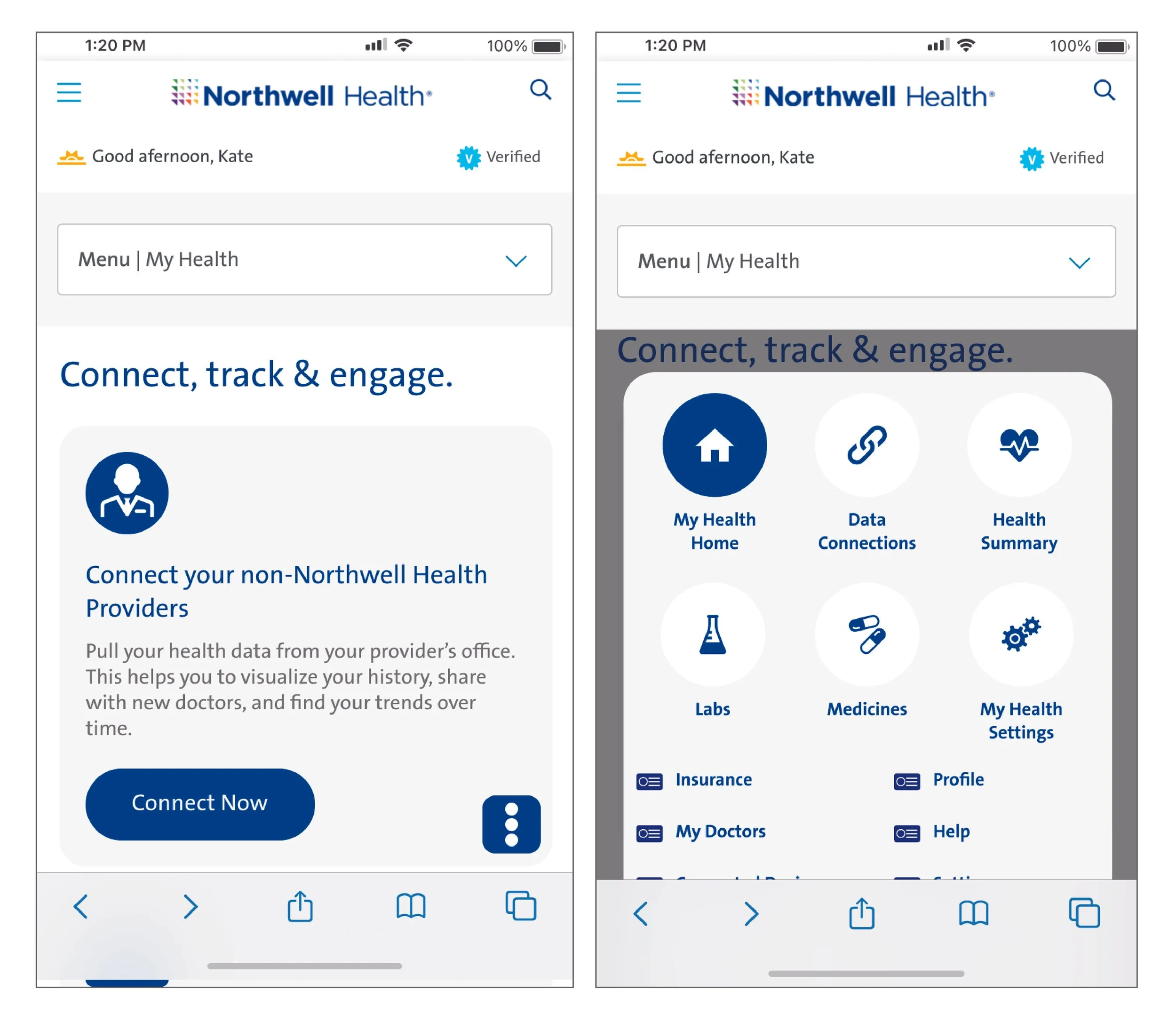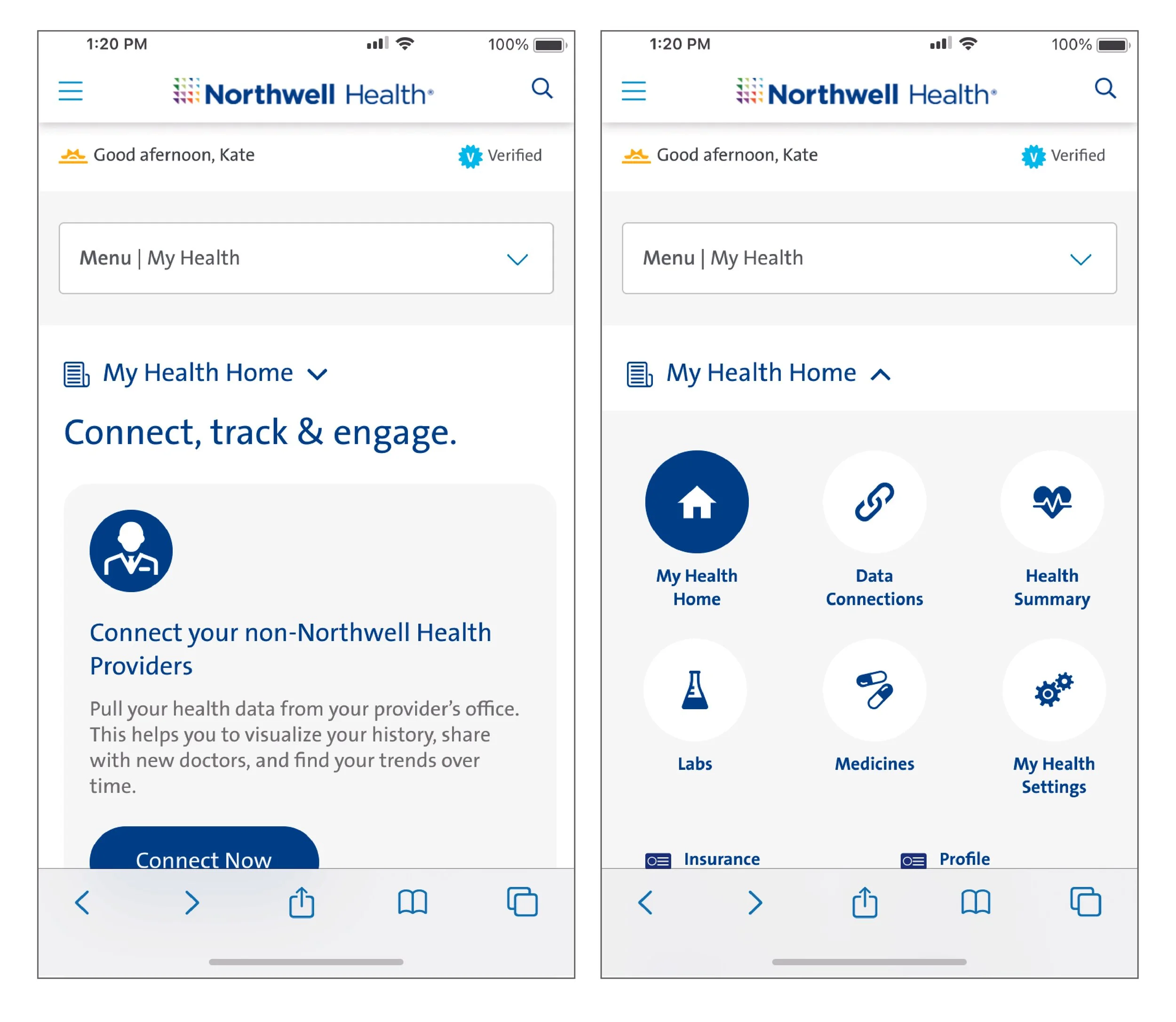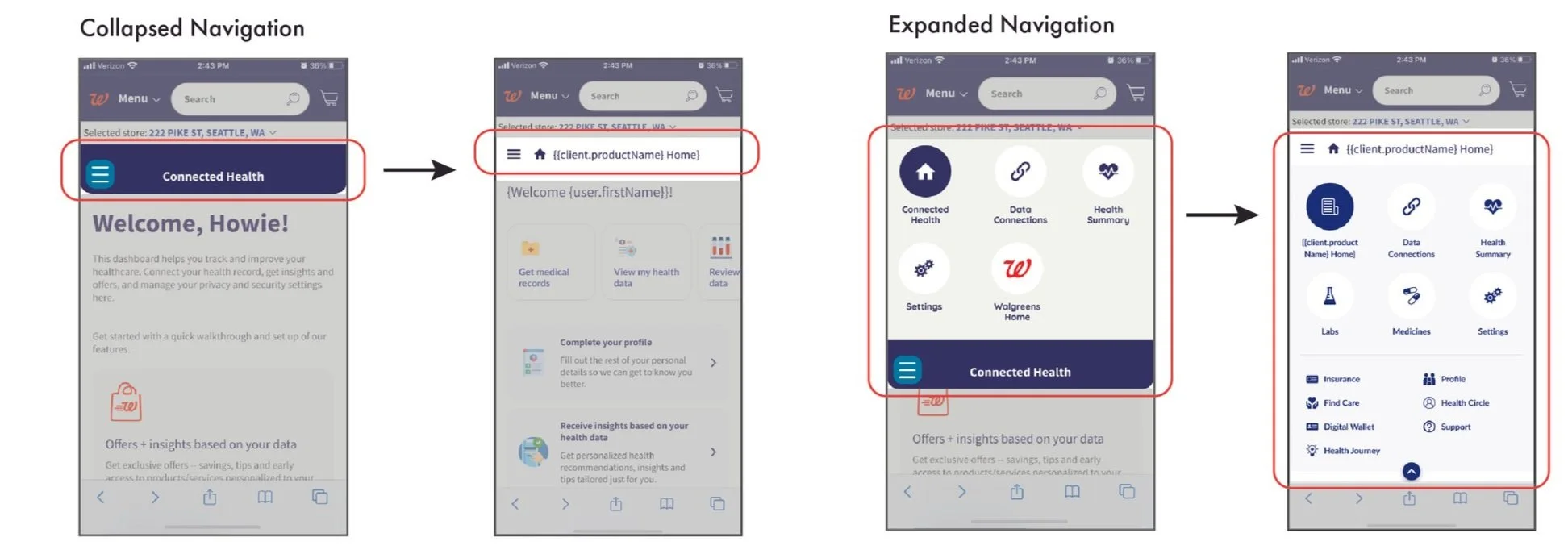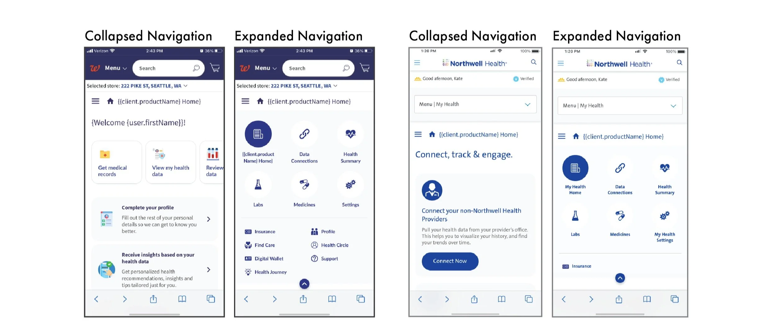 In our short timeframe, we found a solution we thought would best fit the problem. We were not able to do user testing, so we decided to test live to see how users interact with the product. Our final design (shown on the left) for the navigation has an up-and-down arrow that indicates to the user that there is something that “opens.” The file icon and {{client.productName} Home} will update when a user goes to other pages. Below is an example of the final design across Walgreens Health Access and Northwell Health.